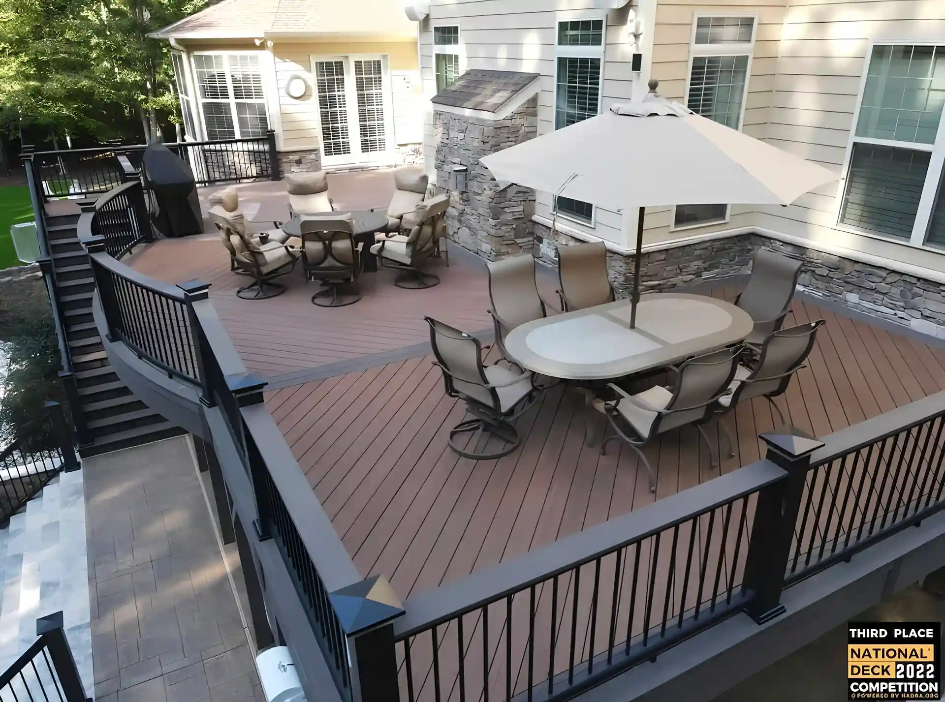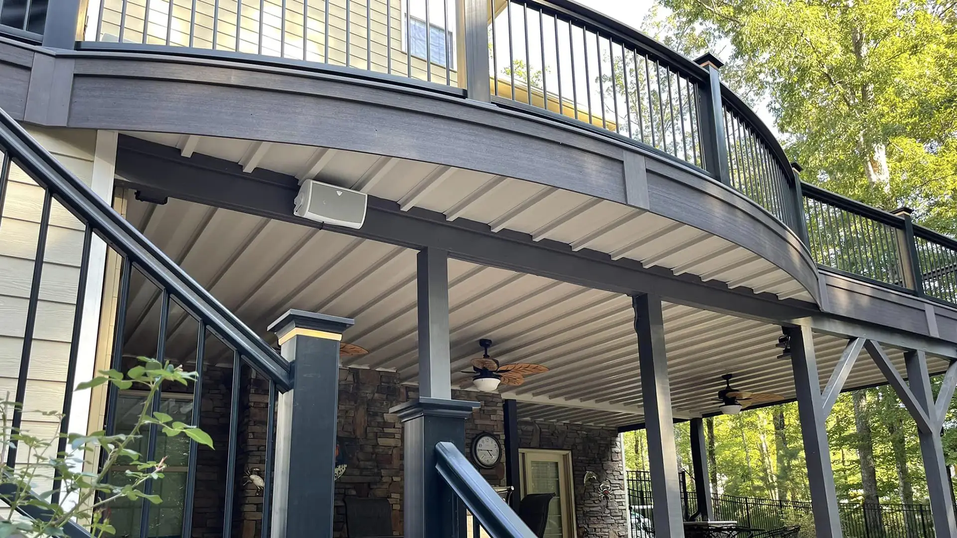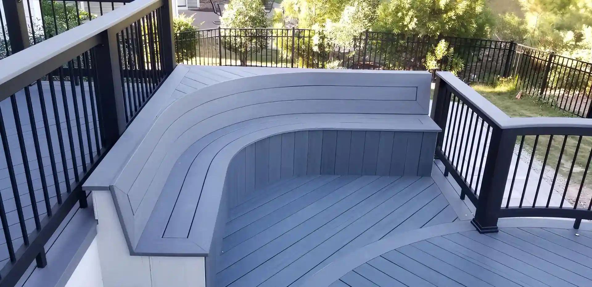 Aerial view of a brown curved composite deck with black aluminum railing