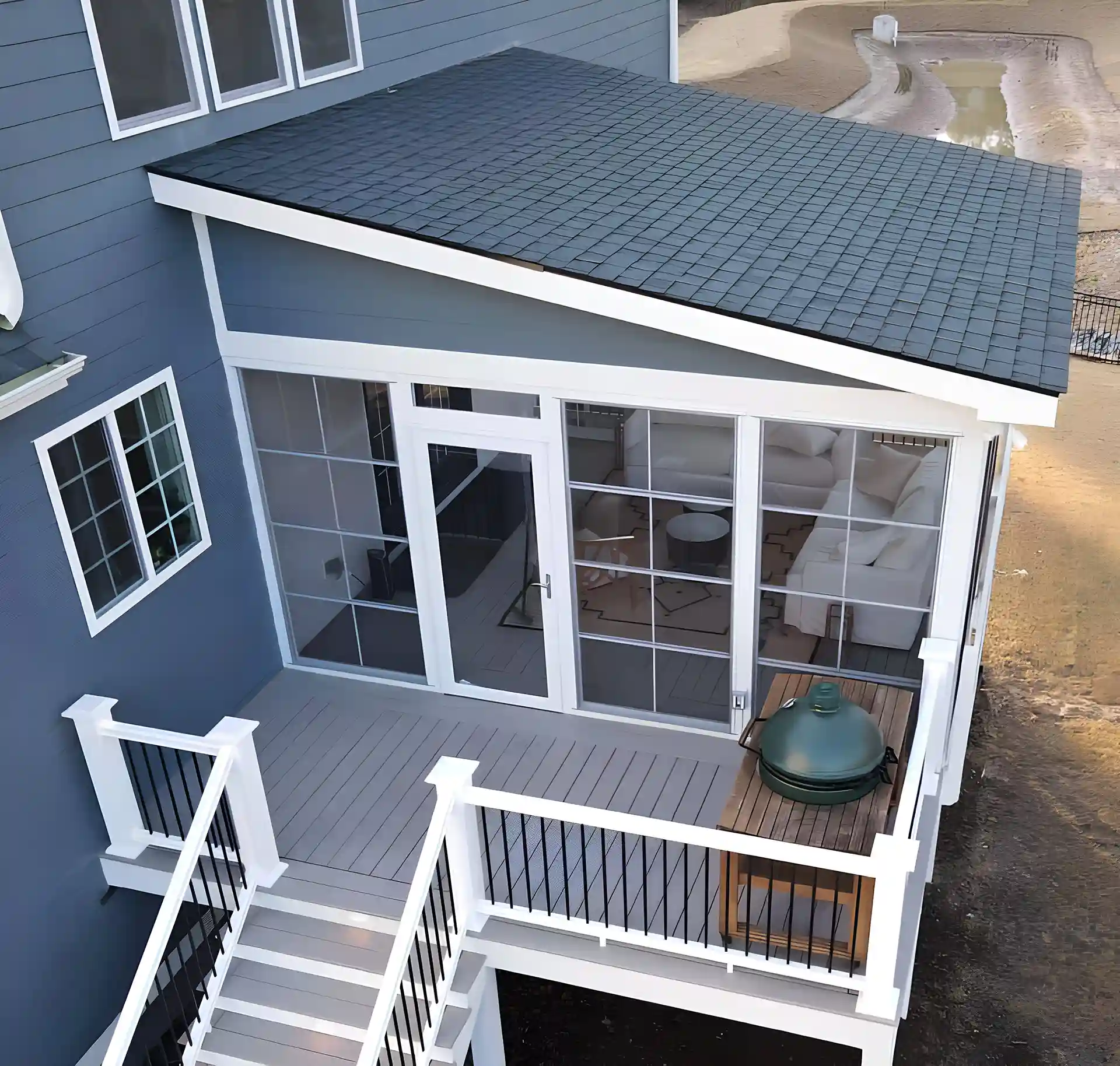 Aerial view of a gray composite deck with black aluminum railing